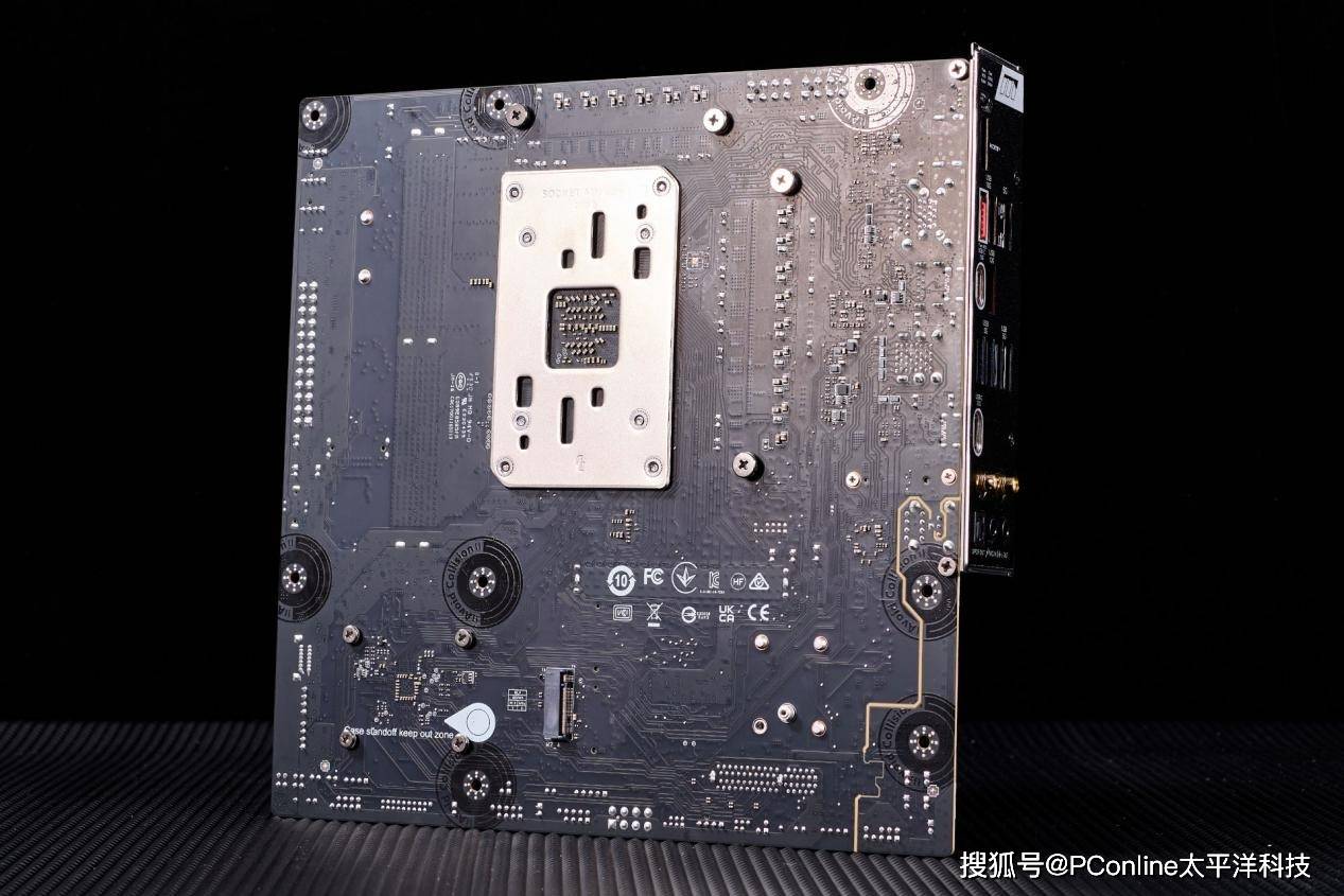 同时,从主板背部能够看到,针对DDR5内存插槽的走线进行了特殊优化与设计,并且采用了SMT焊接工艺,为内存超频奠定坚实基础,尤其适合追求极致性能的用户。