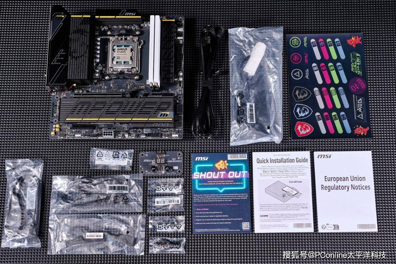配件相当丰富:一根SATA数据线、一根EZconn二合一扩展线(ARGB/风扇)、一个EZ DASHBOARD控制面板及一根面板连接线、M.2 SSD固定螺丝、WiFi 7双天线、快速安装指南、MSI信仰贴纸,以及一张SHOUTOUT活动卡。
