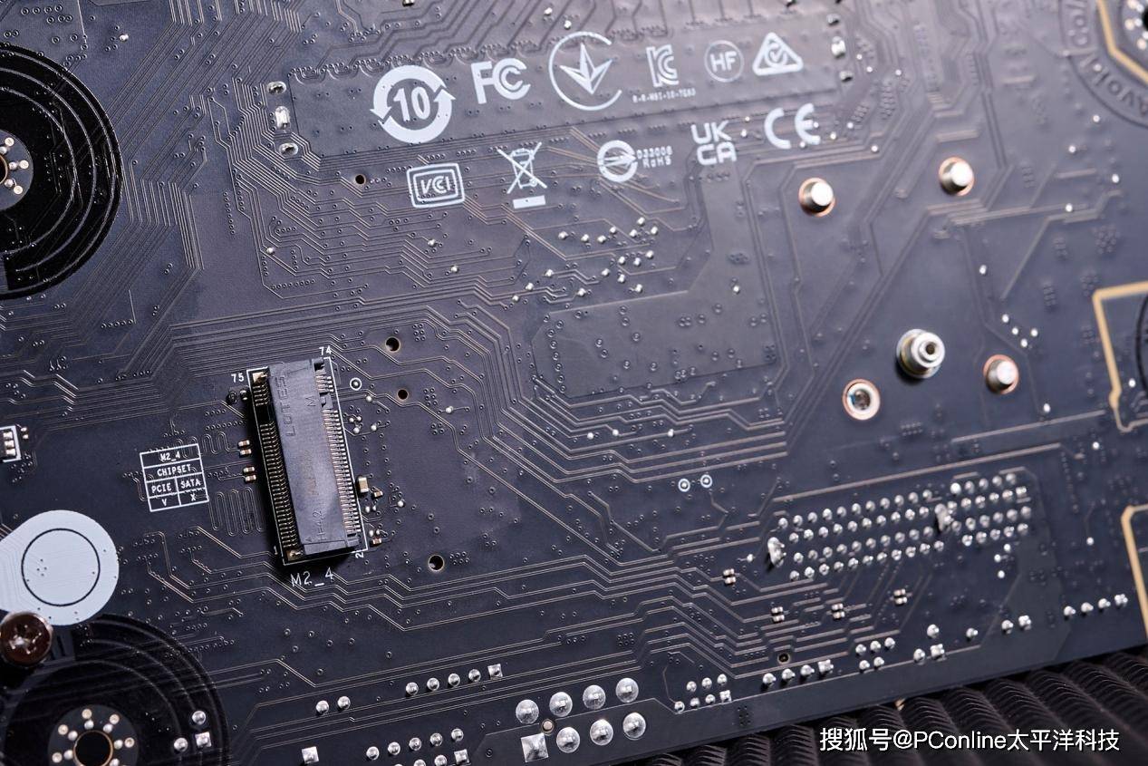 大部分电子元件都布局在正面PCB上,背面PCB看起来简洁了许多。主板上的第四个M.2插槽位于主板背面;需注意的是,此M.2_4插槽由B850芯片组提供支持,最大带宽支持PCIe 4.0 x2。因此,建议大家优先使用前置的三个M.2插槽。