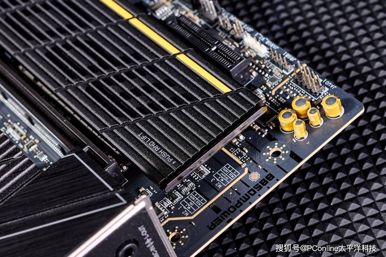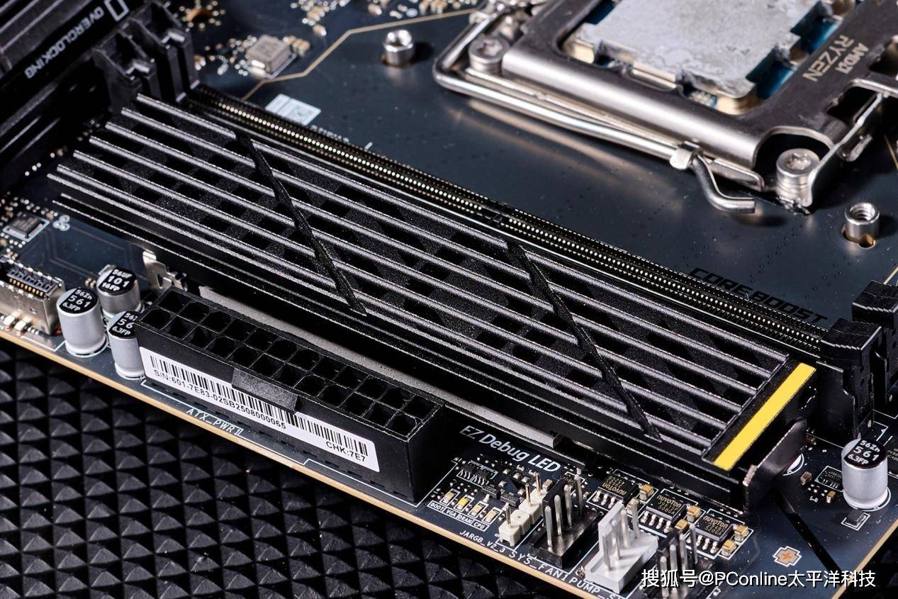 主板底部配备了一块超大面积的散热装甲,其覆盖了南桥芯片以及两个M.2固态硬盘插槽。该散热装甲表面采用交错式内开槽设计,极大地提高了空气对流效率。