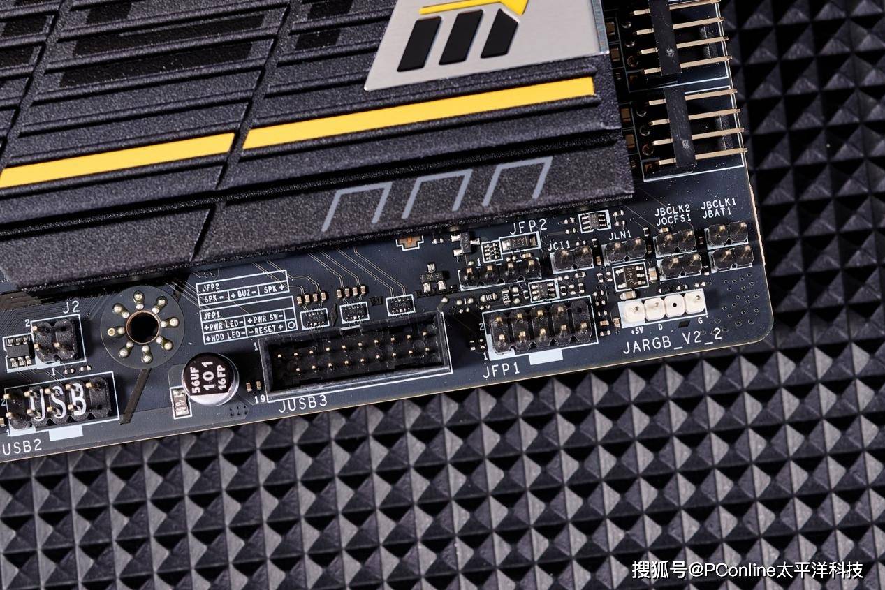 主板右下解也配置了相当丰富的扩展接口,如第二组ARGB灯效接口、前置USB3接口,两组前置USB2.0接口,以及前置面板接口等。