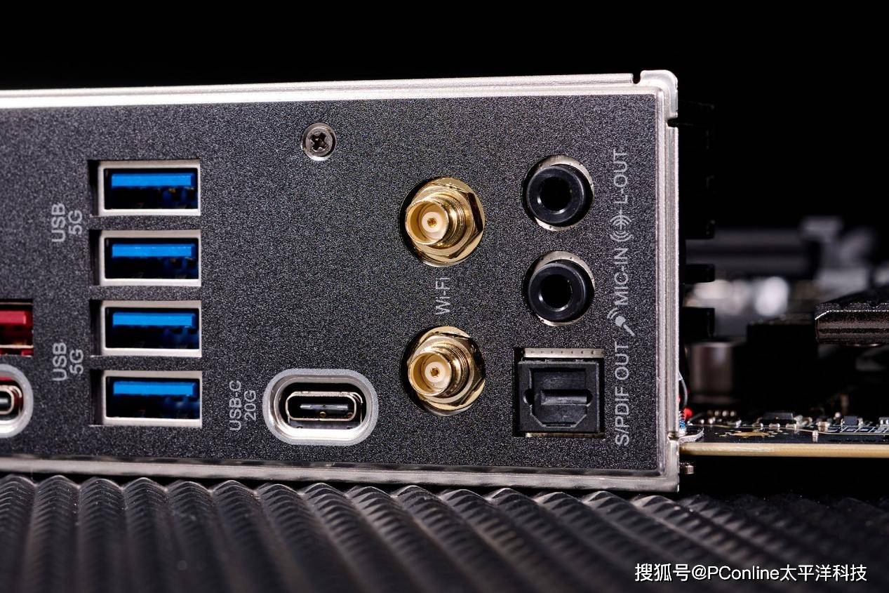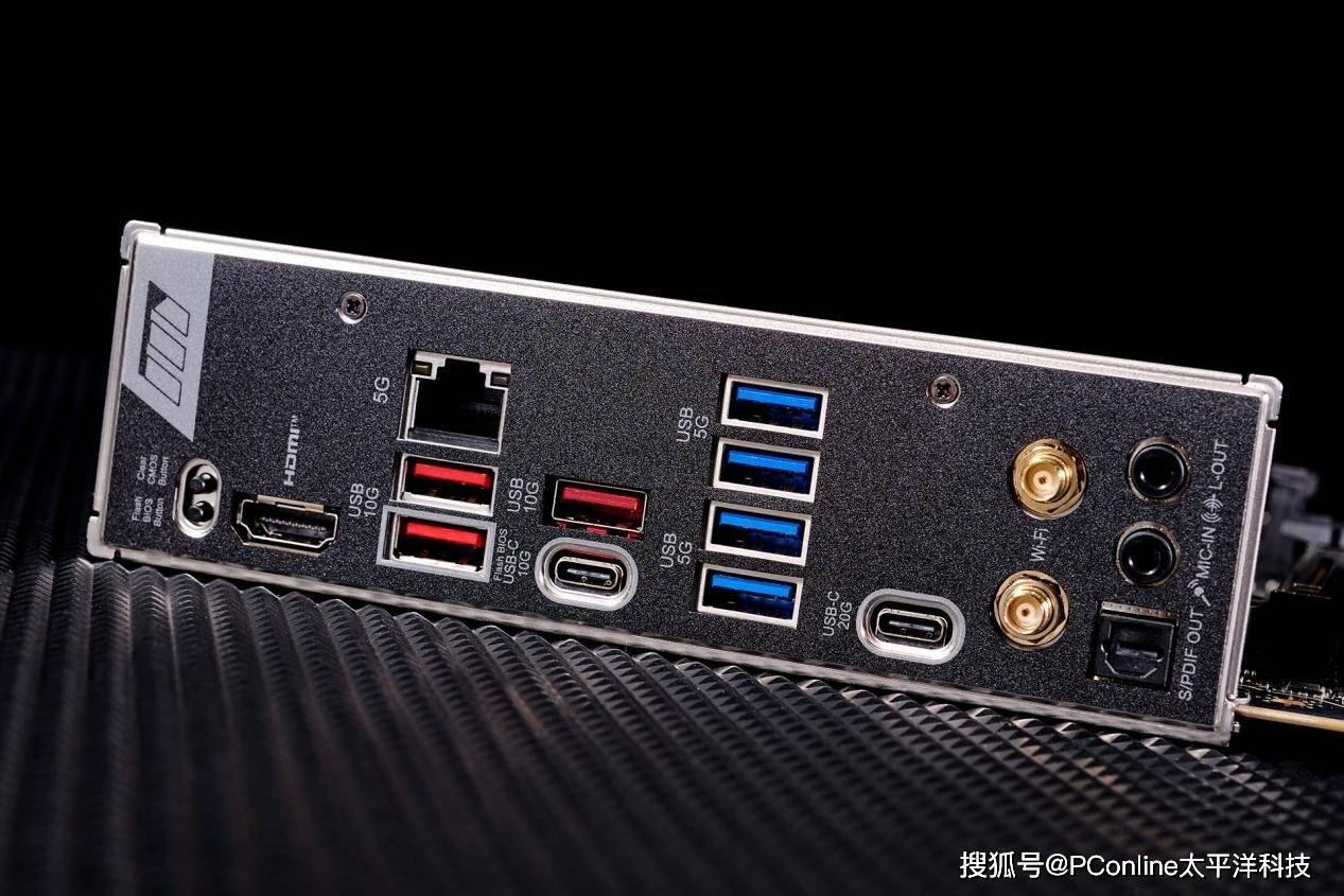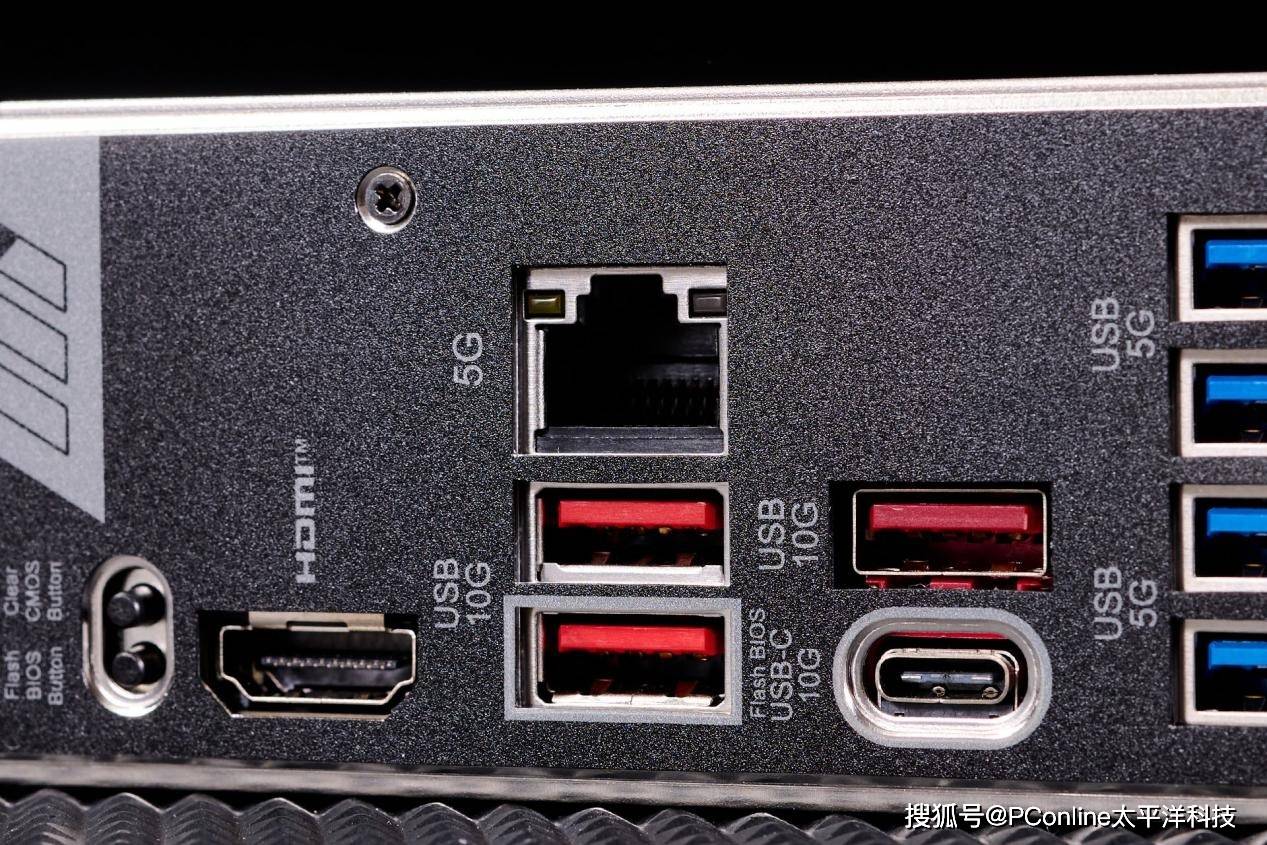 IO后置面板接口也是相当丰富,包括1个更新BIOS按钮、1个清除CMOS按钮、HDMI输出接口、5G有线网线接口、3个USB-A 10Gbps接口(红色)、1个USB-C 10Gbps接口、4个USB-A 5Gbps接口(蓝色)、1个USB-C 20Gbps接口、Wi-Fi天线接口,以及音频接口等。