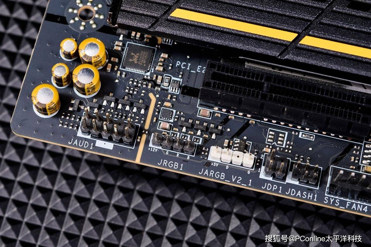 主板底部另外一则为前置音频接口、12 RGB灯效接口,JDASH通信接口,以及最后一组ARGB接口。