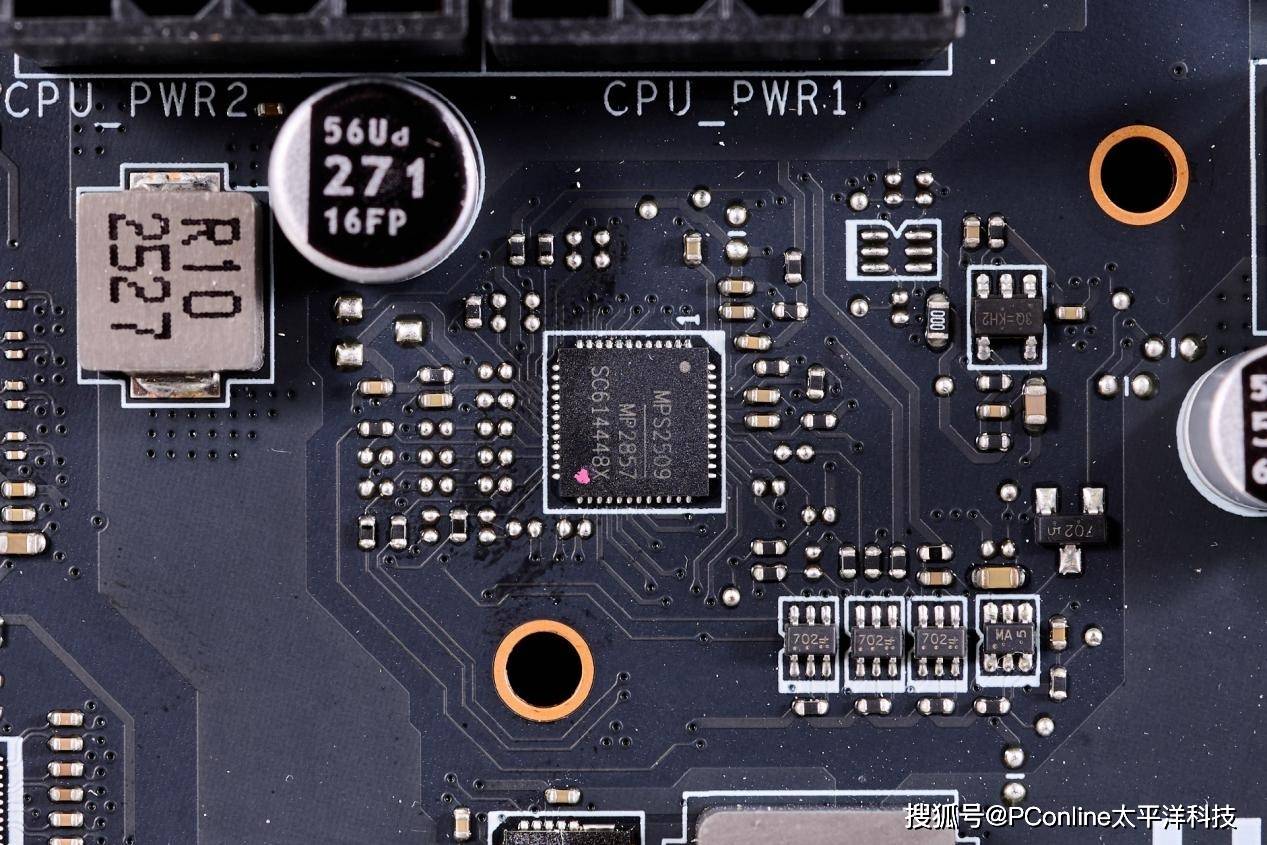 中间12相供电为CPU Vcore提供强劲电流支持,DrMOS芯片均采用了MPS旗下MP87661,单颗最大电流输出能力达60A,具备高效能与低损耗特性。