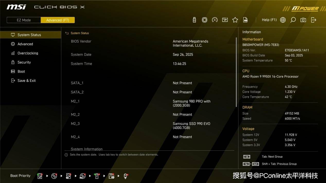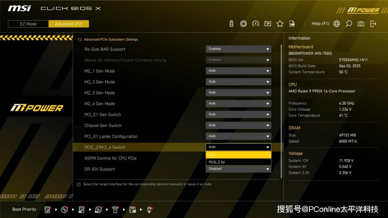 而由于PCIE_2与M.2_4共享PCIe通道,在同样使用时会自动降速为PCIe 4.0 x2模式,但我们可以在BIOS中手动调整优先级,指定PCIE_2使用完整的PCIe 4.0 x4带宽。