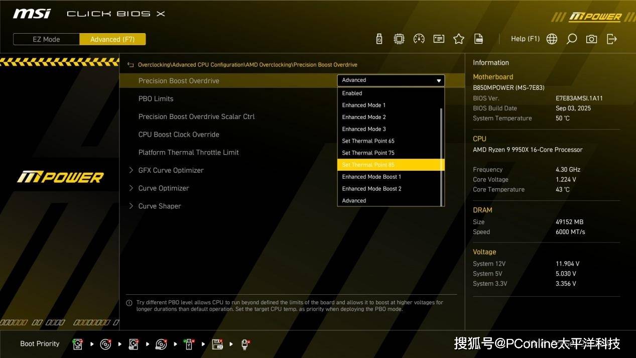 在EZ模式下,我们是可以对CPU PBO模式进行简单的设置;但在高级模式下,用户除了可以选择最简单的PBO模式外,还能对PBO的功耗墙、温度墙进行自定义调节,甚至开启Curve Optimizer功能以实现更精准的性能释放。