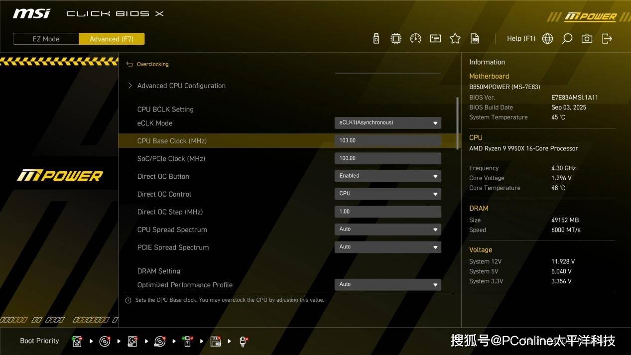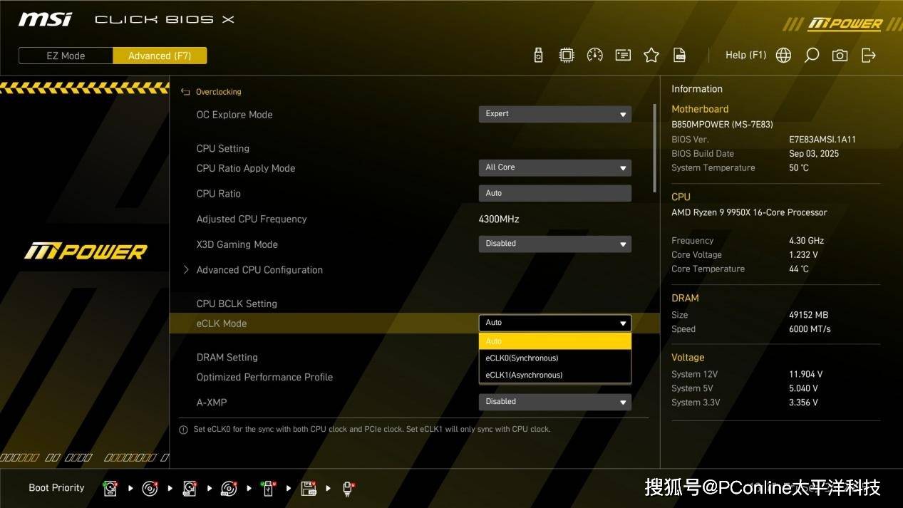 相较一般的B850,微星B850MPOWER主板BIOS中还给出了外频超频选项“eCLk Mode”模式,为追求极限性能的用户提供了更广阔的调节空间。