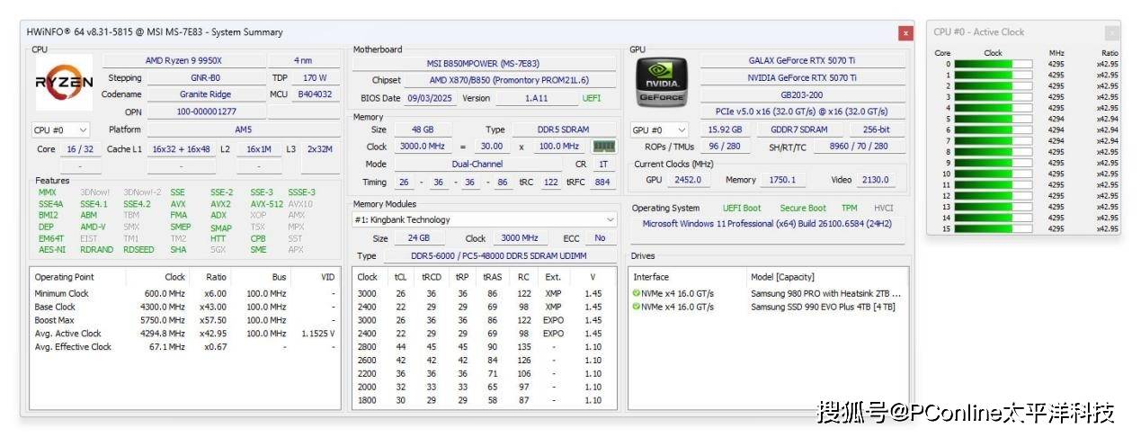 测试平台:AMD Ryzen 9 9950X,金百达 星刃白6000 C26 24G*2微星MPOWER联合内存套装,NVIDIA GeForce RTX 5070 Ti,MPG CORELIQUID P13 360水冷,MEG Ai1600T PCIE5电源。