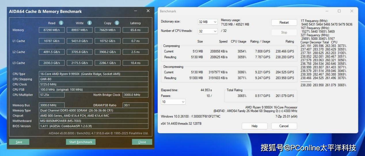 而若我们再进一步使用上微星的高频低延迟内存优化技术,那么内存性能还可再度提升,约为12%,AIDA64读写/拷贝速度突破87290/89937/76629 MB/s大关,延迟进一步压缩至65.6ns以内。这样来看,比默认状态下的内存性能提升接近30%,充分释放了Ryzen 9 9950X对高频低延迟内存的吞吐优势。