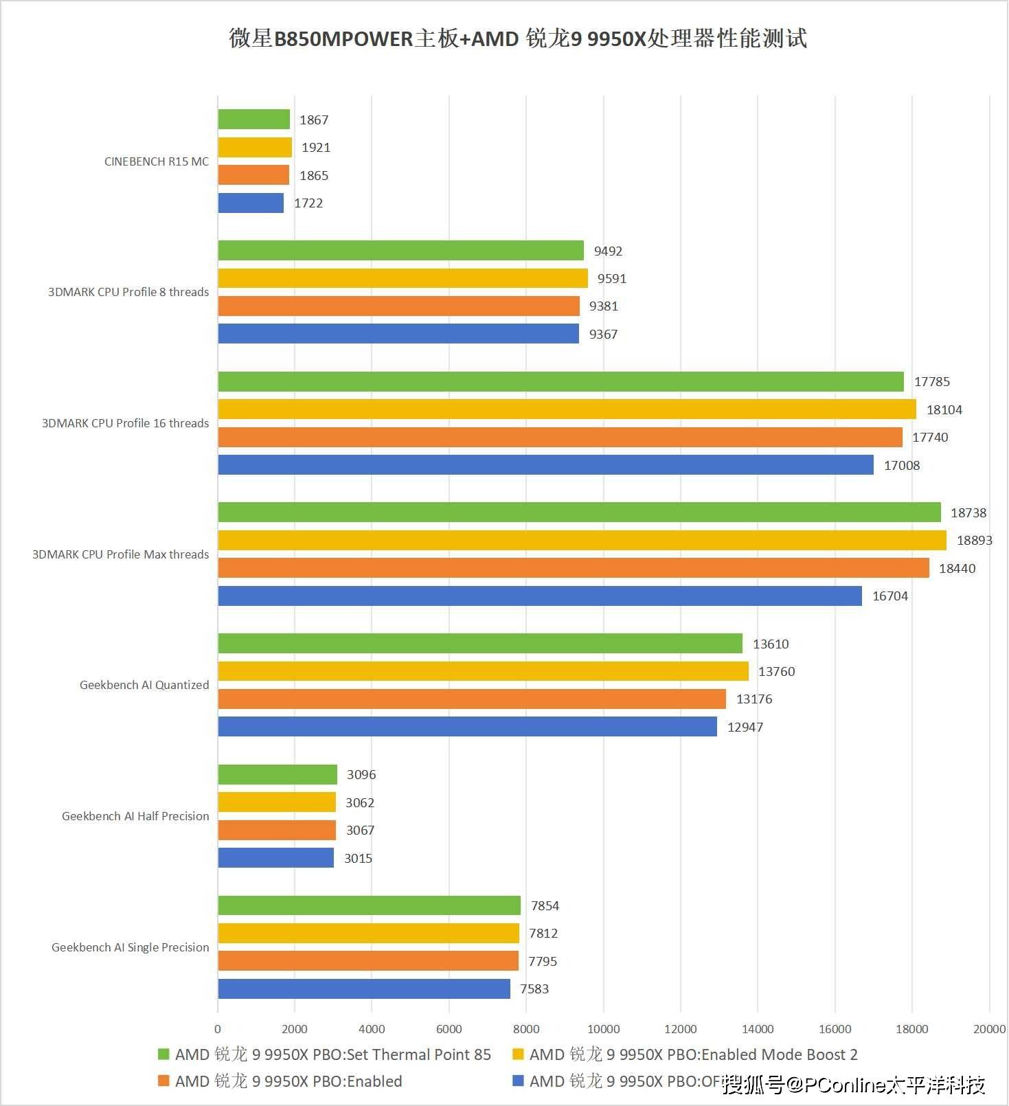 可看到PBO增强2模式的性能是最强的,但是笔者发现其功耗也显著攀升,温度控制压力大幅增加,而且稳定性也面临更大挑战。而PBO 85度模式下比余下的两个模式同样有着更强的性能,同时其功耗与温度表现更为均衡,适合长时间高负载运行。