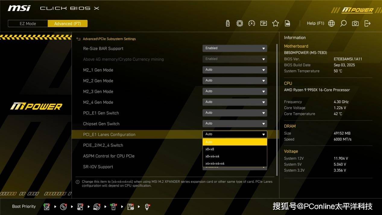 同时PCI_E1插槽通道还能通过BIOS设置切换为PCIe x8+x8模式,或PCIe x8+x4+x4模式,甚至是PCIe x4+x4+x4+x4模式,灵活适配多显卡或高速存储扩展需求。