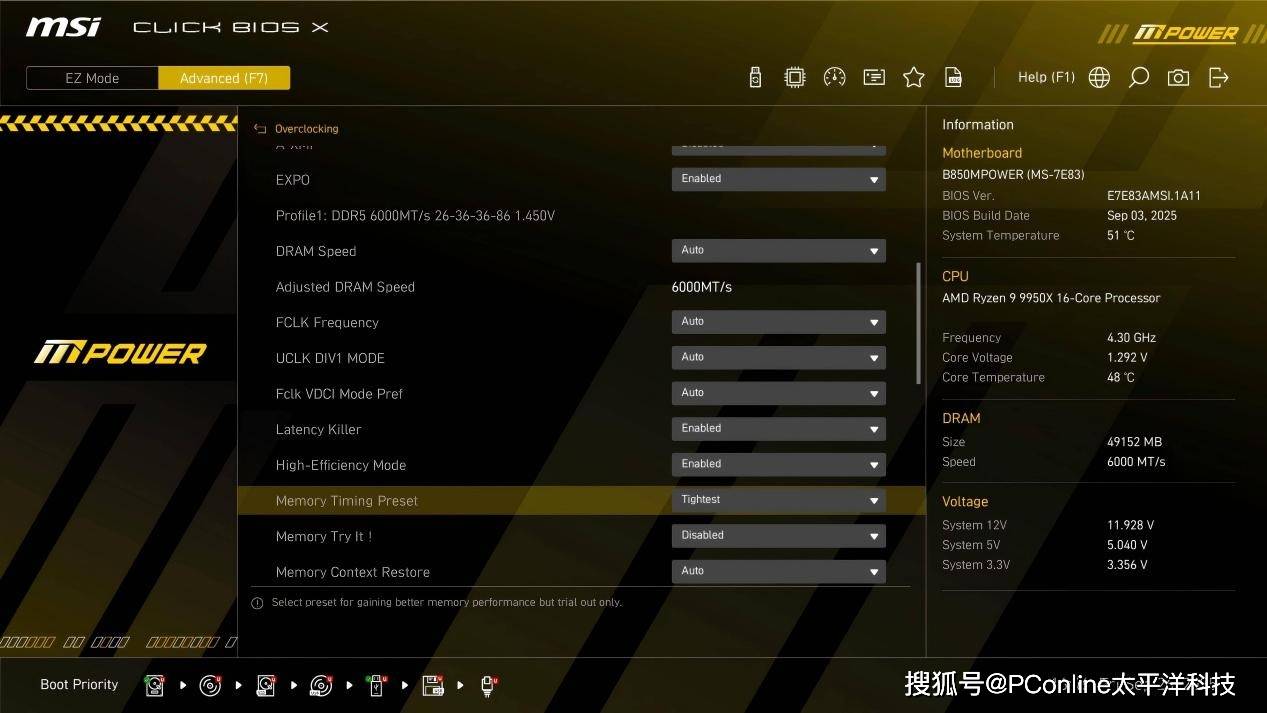 对内存体质有着较强信心的,可以让Memory Timing Preset选择“Tightest”模式,进一步压紧时序参数,挖掘内存性能极限。