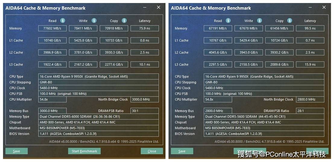 左侧为开启AMD EXPO内存超频模式,右侧为关闭状态下的内存性能