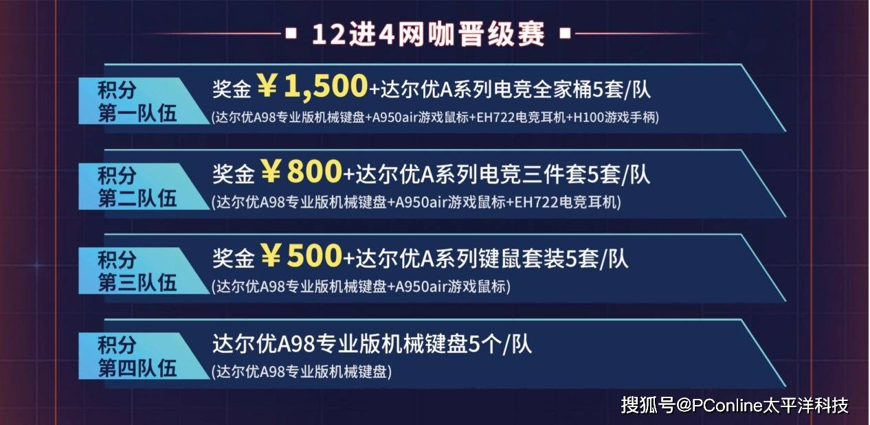 积分第一队伍:将获得1500元现金奖励加上达尔优A系列电竞全家桶(每队5套A98专业版机械键盘+A950air游戏鼠标+EH722电竞耳机+H100游戏手柄)
