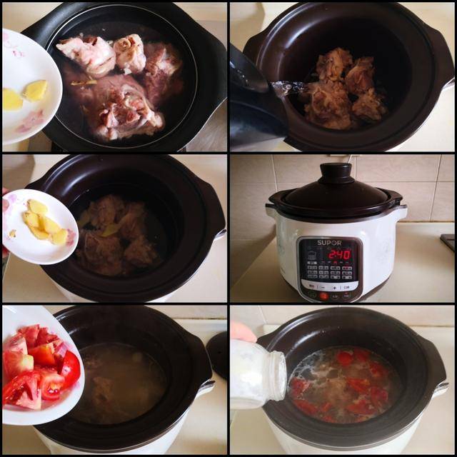 制作过程: 烧锅水,将棒骨块冷水下锅焯煮, 加入姜片去腥,焯出浮沫后捞出放入电炖锅中, 再加入适量的水(注意煲汤时水要一次性加足),加入几片姜, 按下电炖锅上煲骨头汤的功能键, 待到还剩下20分钟左右时,加入准备好的铁棍山药段和番茄继续炖煮,最后炖煮好后加入少许盐和胡椒粉调味,盛入钵中,撒上葱花既可。