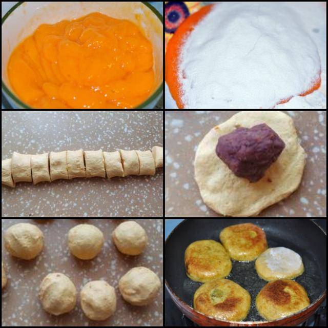制作过程: 将新鲜的柿子去皮后搅打成泥, 加入适量的面粉和发酵粉,再加入少许水,将其和成光滑的面团,加盖后放在食物下发酵。待到面团发酵到2-3倍大时, 拿出来揉搓排出气体,再搓成长条,分割成大小相同的面团。取出一个面团擀成圆片,包入适量的豆沙馅料, 再将其包裹好搓成圆球,再按压成饼。 烧热锅放入少许油。将制作好的豆沙柿子饼放入锅中中小火煎,先将其煎熟,再煎至双面金黄既可。