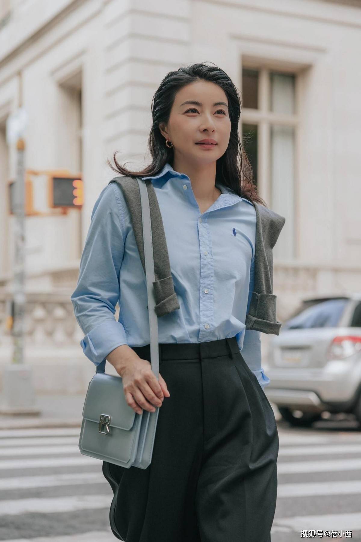 再看郭晶晶选择的这件蓝色衬衫,V领设计恰到好处地展现了优雅的颈部线条,同时又不会显得过于暴露。衬衫的材质看起来柔软舒适,与郭晶晶一贯低调内敛的气质十分相配。