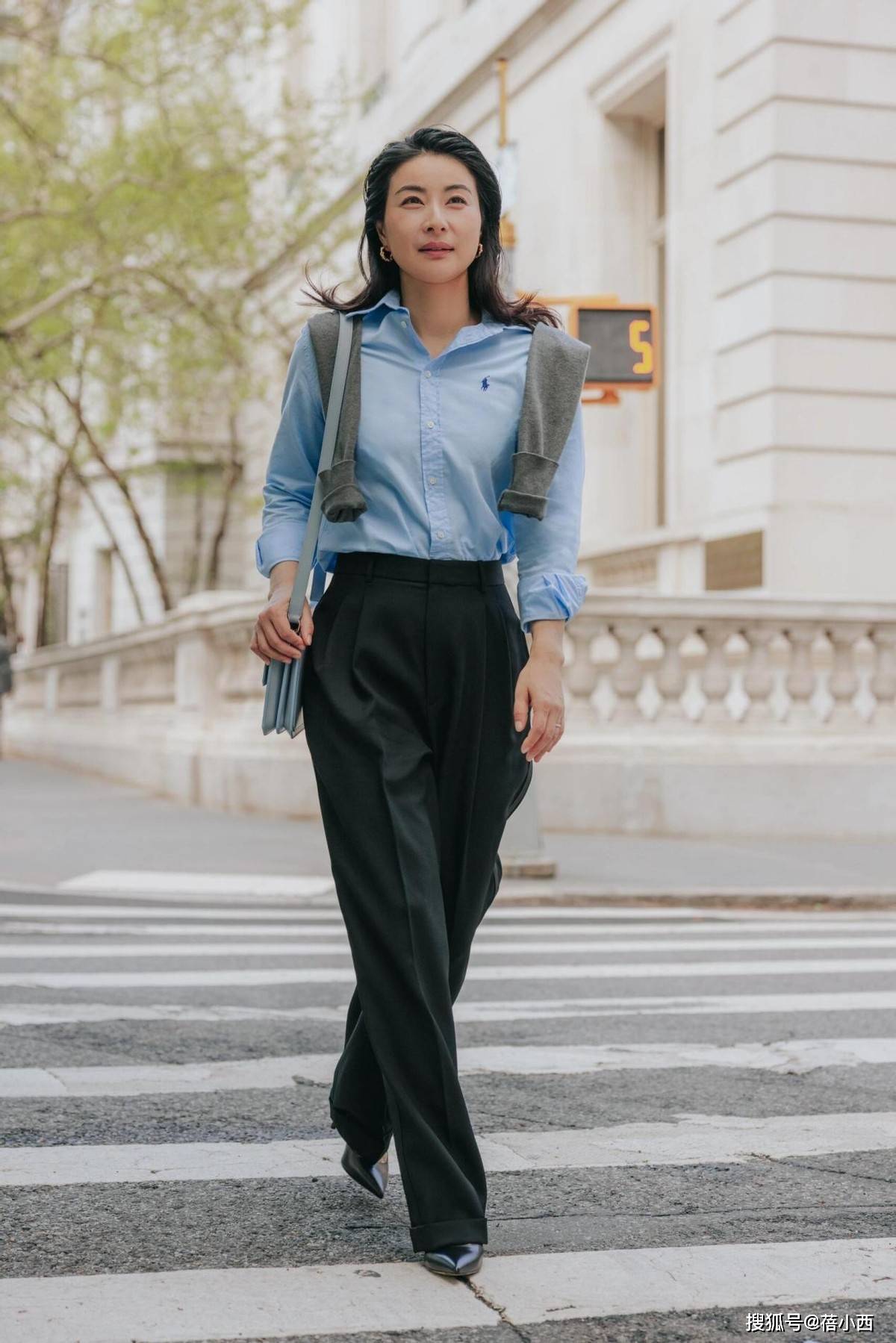下装选择的灰色阔腿裤堪称职场女性的衣橱必备单品。高腰设计拉长腿部比例,阔腿裤型既能修饰腿型又显得随性大方,搭配黑色尖头鞋,在正式与休闲之间找到了完美平衡。