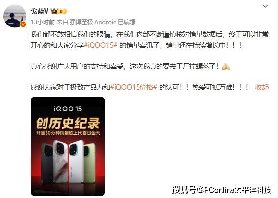 编辑点评:iQOO 15首销取得的惊人成绩,充分证明了其在性能、屏幕、续航等方面的全面升级得到了市场的认可。特别是在游戏体验上的突破性创新,使其在竞争激烈的旗舰机市场中脱颖而出。不过,持续的热销也对供应链和产能提出了更高要求,如何维持这股销售势头将是iQOO面临的下一个挑战。从产品经理“拧螺丝”的玩笑中也能看出,品牌方对这样的销售表现既惊喜又倍感压力。