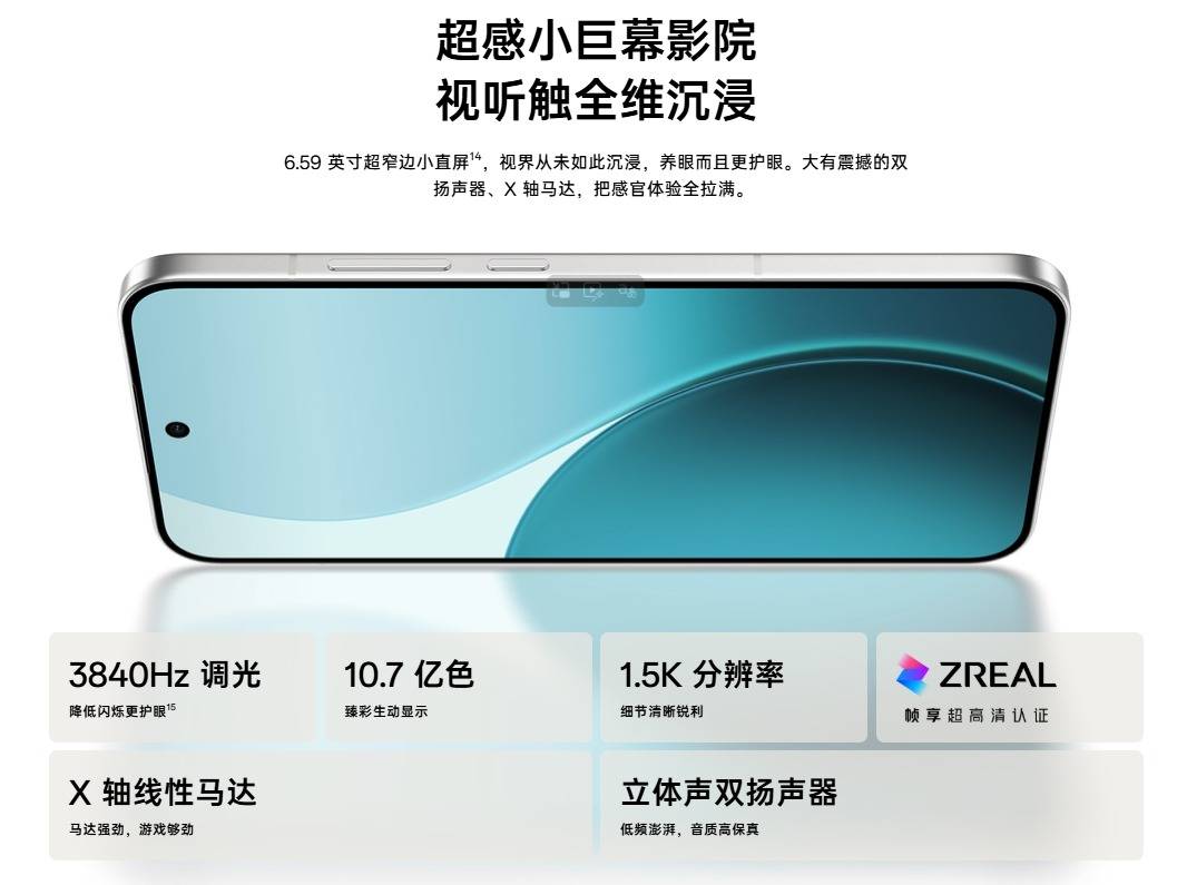 屏幕方面,Reno14标准版采用一块 6.59 英寸超窄边小直屏,分辨率达到 1.5K,支持 10.7 亿色显示与 3840Hz 超高频 PWM 调光,无论明暗环境都能呈现细腻柔和的视觉观感。ZREAL 触觉超高清认证加持,使画面层次更通透、色彩更真实。立体声双扬声器与 X 轴线性马达的组合进一步增强了影音沉浸感,无论观影、游戏还是日常滑动操作,都能带来更顺滑、更具临场感的体验。