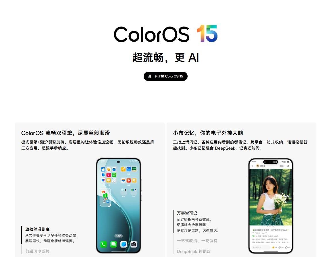 ColorOS15系统也在此次升级中迎来全面革新。全新的DeepSeek智能引擎支持“所见即可问”“AI 构图”“智能滤镜”等多项功能,从拍照、创作到日常使用都更加便捷高效。系统动画与后台管理进一步优化,为用户带来更沉浸的交互体验与更强的流畅稳定性。