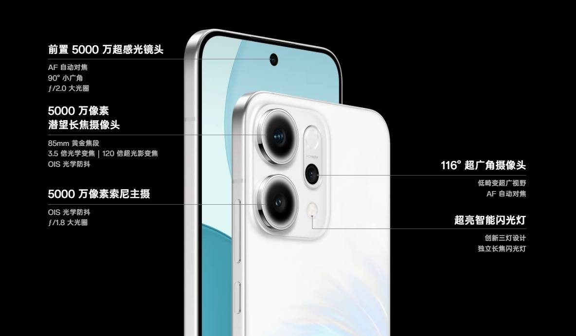 影像系统方面,Reno14 延续了 OPPO 一贯的影像基因,首次搭载“三合一实况影像系统”,将高清长焦实况照片、4K视频转实况照片与闪光实况模式深度融合,为用户带来更具生命力的记录体验。后置主摄采用5000万像素索尼大底传感器,配合OIS光学防抖,在夜景、人像与日常拍摄中都能呈现清晰细腻的画面表现。85mm等效焦距的 5000万像素潜望长焦镜头支持3.5倍光学变焦与 120 倍数码变焦,远景细节同样锐利分明。116° 超广角镜头适合风光与人文拍摄,画面空间感更自然。前置5000万像素超感光镜头具备 90°广角自拍视野,让每一帧都更真实立体。