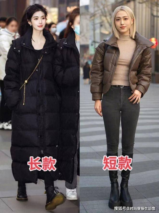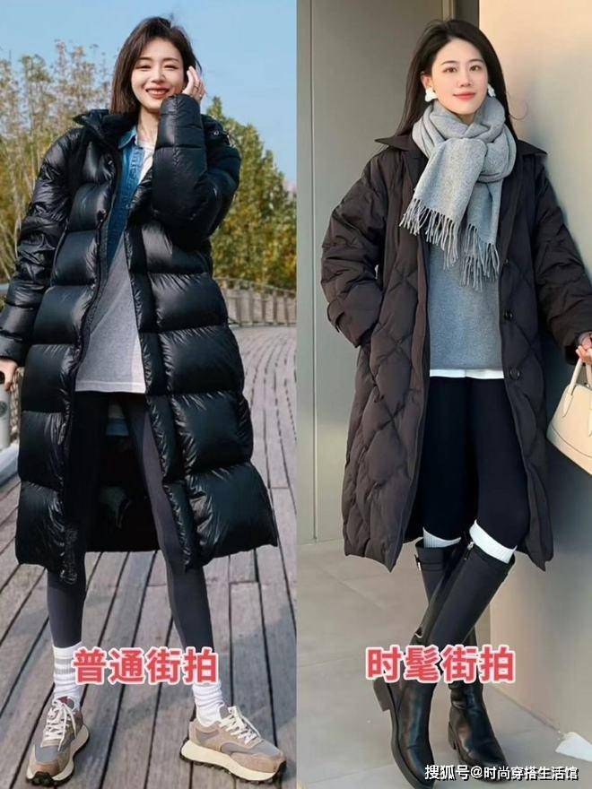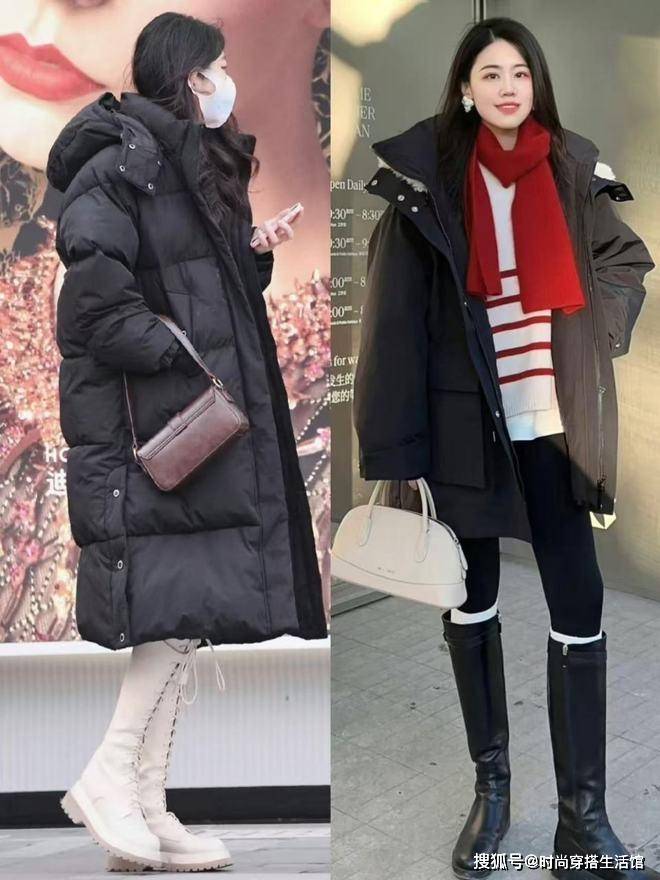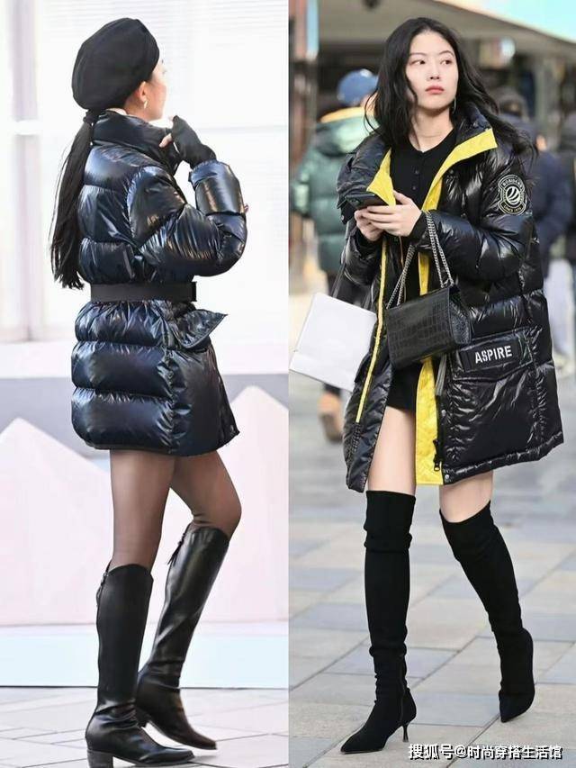 其次降温后对于北方城市的小姐姐来说长大衣的保暖度可能不够强,那么我们还可以选择长款羽绒服;脚上搭配同色系的长筒靴,也能让我们的整个造型变得更加时髦和高级。对于秋冬季节来说我们选择的长羽绒服和长靴尽量纯色,要避免选择花哨和鲜艳的色彩,从而暴露身材缺点。