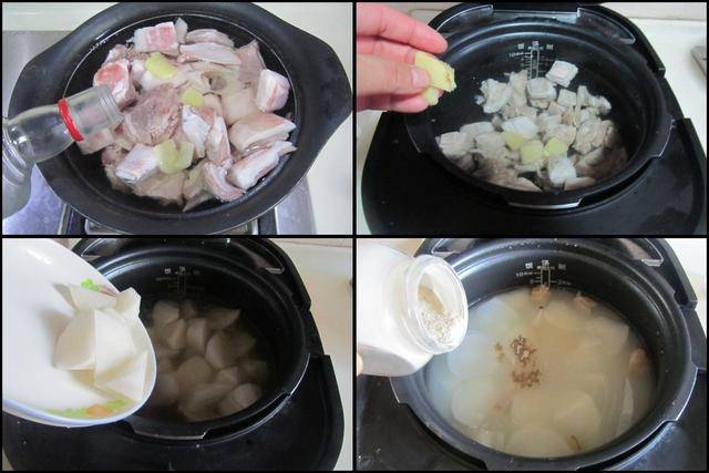 制作过程: 将羊排剁成小块; 白萝卜去皮后切成滚刀块备用; 将羊排块放入冷水锅中焯煮,加入姜片和大葱段、高度白酒去腥; 焯出浮沫后羊排用热水冲洗干净后放入电炖锅中,加入姜片和适量的水,加盖按下电炖锅上煲汤的功能键, 待到还剩下半个小时的时候,放入准备好的白萝卜块炖煮,待到炖煮好后加入盐和胡椒粉调味,最后放入少许葱花既可。