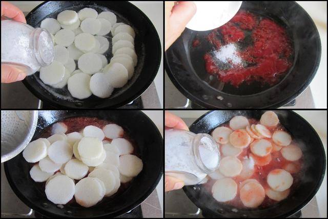 制作过程: 将山药去皮后切成片备用。 烧锅水加入1小时盐, 将山药片放进锅中焯烫两分钟后捞出备用。 烧热锅放入适量的油, 加入少许番茄沙司放进锅中煸炒几下, 加入1勺白糖翻炒均匀,再加入焯好的山药片放进锅中翻炒几下,加入少许水焖煮两三分钟后加入少许盐调味,大火收汁后盛入钵中,撒上少许葱花既可。