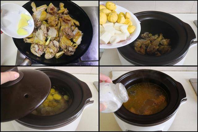 制作过程: 将土鸡剁成小块备用; 山药去皮后切成段备用。 烧热锅放入少许油,加入土鸡块放进锅中翻炒,炒干水分后加入少许姜片继续炒上几下, 将炒过的土鸡放入电炖锅中,加入适量的水,注意煲汤时要一次性将水加足,加盖后按下电炖锅中炖煮鸡汤的功能键, 待到还剩下30分钟时加入准备好的板栗和山药段放进锅中继续炖煮,炖煮好后加入少许盐和胡椒粉调味,最后炖煮好后加入少许盐和胡椒粉调味,盛入钵中撒上少许葱花既可。