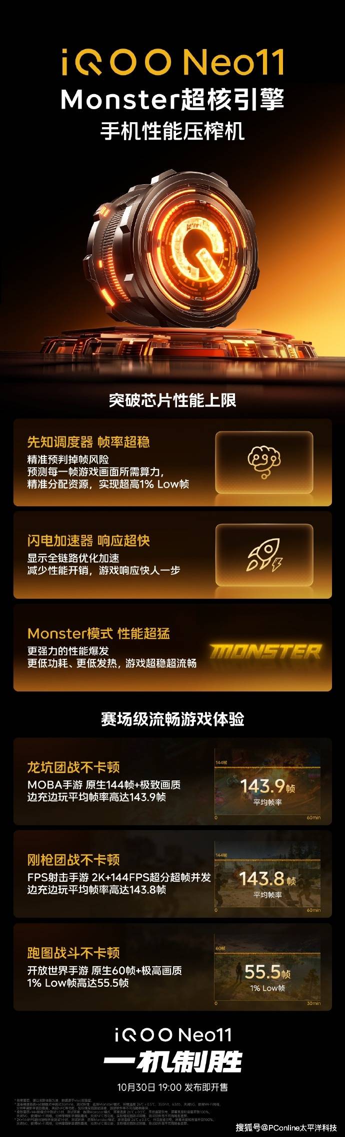 在 Monster 超核引擎的加持下,iQOO Neo11 带来领先的游戏体验,可以实现畅玩 MOBA 手游原生 144FPS + 极致画质,边充边玩平均帧率高达143.9FPS、畅玩 FPS 射击手游 2K + 144FPS 超分超帧并发,边充边玩平均帧率高达 143.8FPS,以及畅玩开放世界手游原生 60FPS + 极高画质,1% Low 帧高达 55.5FPS,轻松拿捏各大 Top 游戏重载场景。