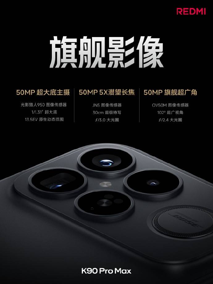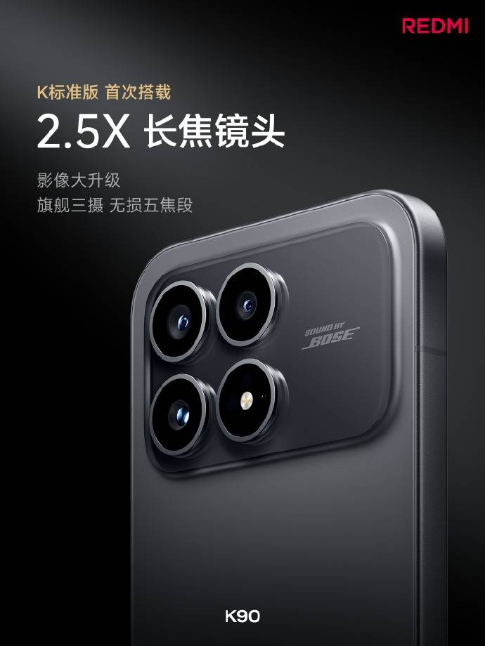 影像上首次搭载2.5X长焦,主要由50MP主摄+50MP长焦+8MP超广角的旗舰三摄组成。同时,REDMI K90拥有超线性对称双扬、IP68防水、X 轴线性马达、NFC等多项配置或功能。