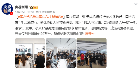 此前,据央视新闻报道,小米 17 系列开售 5 天销量即突破 100 万台。更早的记录显示,该系列全系开售仅 5 分钟,便刷新 2025 年国产手机全价位段首销全天销量及销售额纪录。