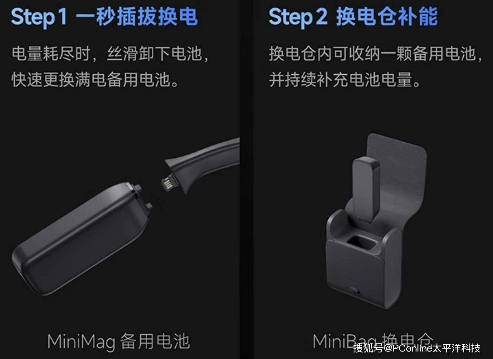 主电池被集成在右侧镜腿,支持热拔插快速更换。单块电池能支持连续使用4小时。而在你换电的瞬间,左侧镜腿的副电池会立刻自动接管供电,确保设备全程不断电。如果再搭配上那个小巧的便携式换电仓,用户可以随身携带两块备用电池,轻松实现全天候续航。