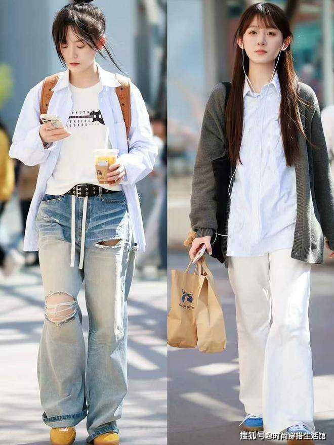 比如,白衬衫配牛仔阔腿裤和德训鞋,在露出的脖颈位置佩戴细节作为点缀,手提菜篮子包包,松弛感中凸显精致感,赢得不费力的高级!