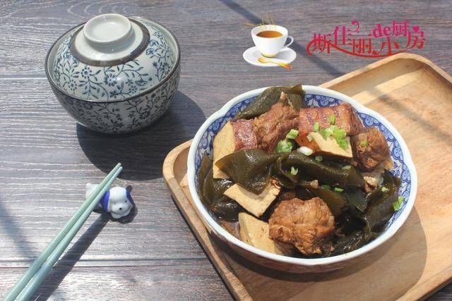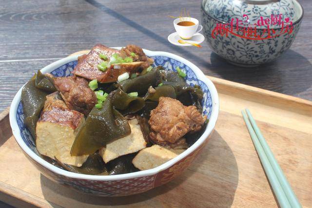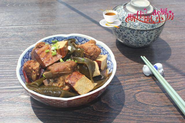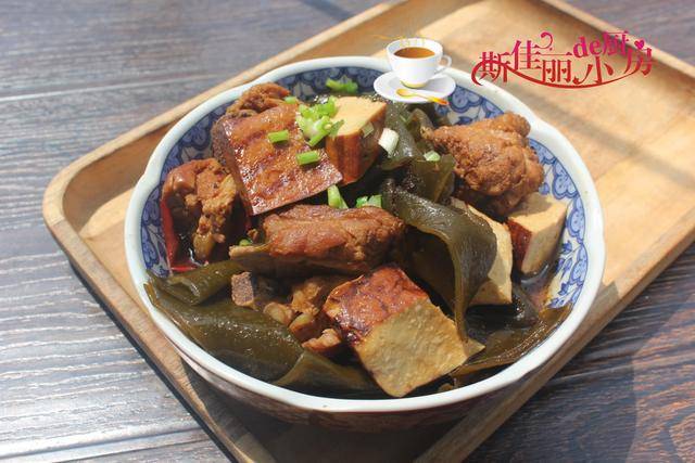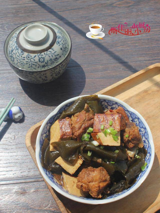 小贴士:1. 选用肋排,剁成麻将大小的块, 更易烧熟入味, 将其泡在清水中,中途换一下水; 2. 用少许油加入冰糖不停地翻炒制作融化呈棕色,再将泡过的排骨块进锅翻炒上色,再加入调味料汁翻炒几下; 3. 将炒过的排骨和海带结放进电炖锅中,加入少许水炖煮; 4. 待到排骨炖煮至九成熟后加入香干块放进锅中继续炖煮五分钟,最后加入盐等调味既可。