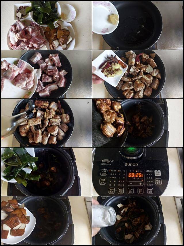 制作过程:1. 准备好原材料, 将肋排剁成麻将大小的块,香干切成片备用; 2. 烧热锅放入少许油,将冰糖块放进锅中煸炒,不停地翻炒至完全融化呈棕色; 3. 加入泡过的排骨块放进锅中翻炒至表面微微发黄; 4. 加入姜片和花椒等大料放进锅中翻炒几下; 5. 加入少许料酒和生抽翻炒均匀; 6. 将炒过的排骨放进电炖锅中; 7. 加入准备好的海带结放进锅中,加入少许水; 8. 加盖按下电炖锅中炖煮;9. 待到还剩下5分钟时,加入准备好的香干片放进电炖锅中炖煮; 10. 最后加入少许盐和胡椒粉调味,翻炒均匀;