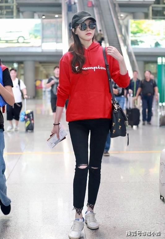 这一套搭配中,唐嫣选择了一件红色连帽卫衣,红色鲜艳夺目,让她可以瞬间成为人群焦点。胸前的白色字母印花为简约的卫衣增添了设计感,看起来特别显年轻,能很好地提升整体造型的活力感。
