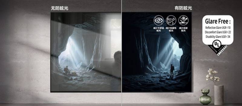 很有意思的是一点是,每次我们看到厂商宣传自己低反效果多好的时候,都会把各种大面积的环境光、灯光直晒到屏幕上去对比,像三星之前宣传自己的低反膜还直接把阳光射到屏幕上。有效果么?当然有!但是否实用?那就不见得了!实际上,从我们大多数人看电视的环境而言,更多是在下班放学天色已晚后打开电视,电视主要受到的光线影响,来自于室内灯光,而非其他环境光,更不用说阳光直射这样的环境了。