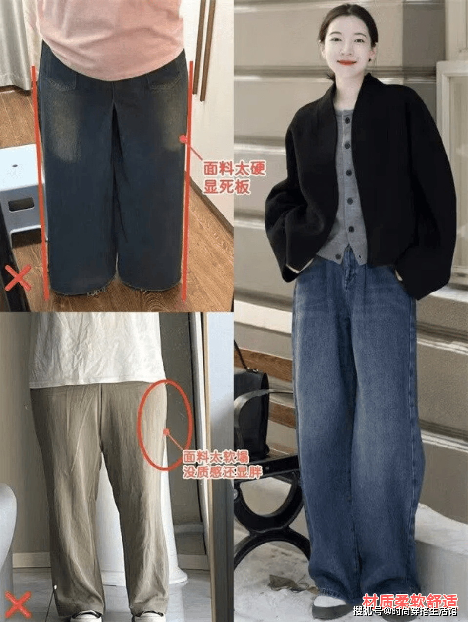 最后我们还要关注阔腿裤的材质,像是太软塌的材质穿在身上的话修饰不了腿型,太硬的材质又会显得不舒适和膨胀,那么最好的方式就是选择有垂感又舒适的面料,比如像是灯芯绒、毛呢、针织、羊毛和牛仔之类的材质,这样穿起来不仅舒适同时还舒适有型。