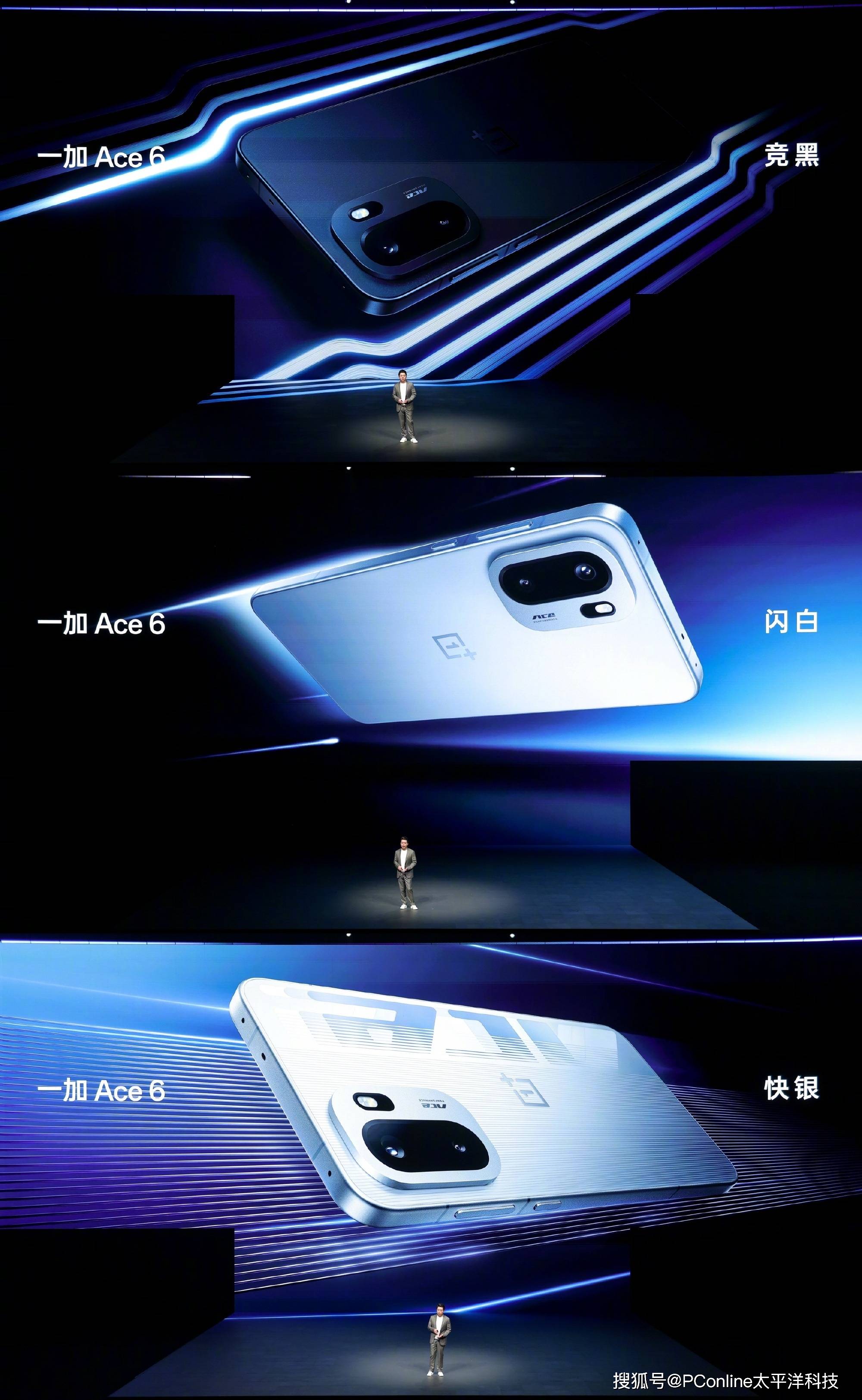 一加 Ace 6同样有三款配色供用户选择,分别是快银、闪白以及竞黑。快银采用了独家自研的「银紫幻彩微渐变工艺」,可以在机身明显看到ACE系列专属的拉丝徽标,机身背板带来的速度感拉满;闪白则是采用独家自研的「超低闪 AG 玻璃工艺」,带来纯粹的白色;竞黑采用了独家自研的「高雾低闪砂工艺」,带来低调内敛的黑色,也带来舒适的手感。