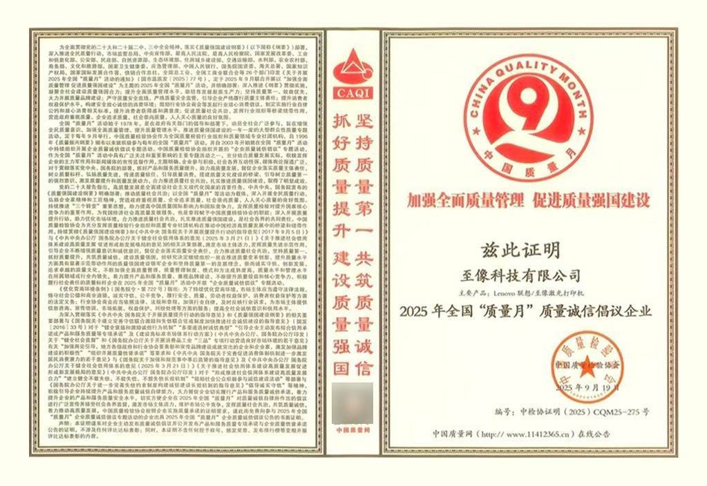 在2025年全国“质量月”活动中,至像科技凭借卓越的品质管控与诚信经营,第四次荣膺中国质量检验协会授予的“质量诚信倡议企业”称号,成为打印行业连续四年获此国家级殊荣的代表,彰显了其在质量领域的标杆地位。