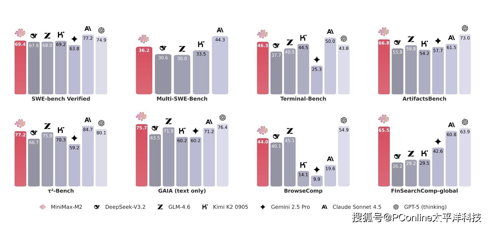 据悉,M2在Agent最核心的三个能力——编程、使用工具和深度搜索上表现出色。根据官方公布的对比数据,M2在使用工具和深度搜索方面已非常接近海外顶级模型,而在编程能力上,也达到了国内的顶尖水平。