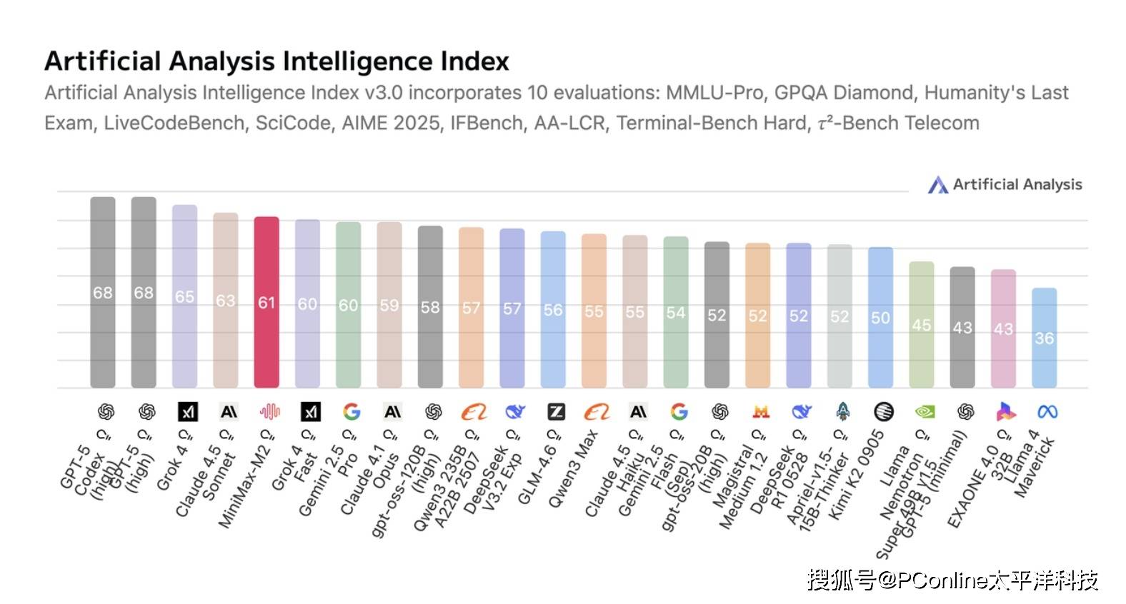 当模型在复杂的Agent场景中得到锤炼后,其能力也自然迁移到了传统的大模型任务上。在整合了10个测试任务的Artificial Analysis全球榜单上,M2模型已跻身全球前五。