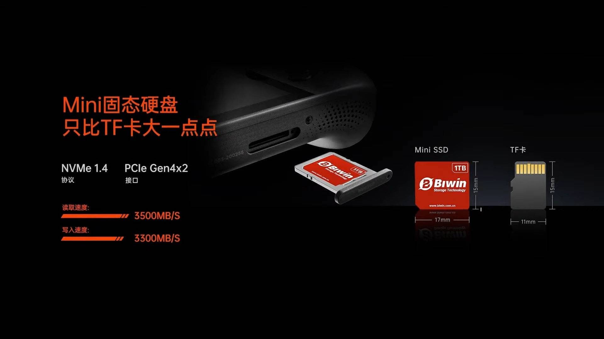 存储方面,该掌机支持1个M.2 2280 PCIe 4.0 SSD插槽与1个 Mini-SSD插槽同样支持PCIe 4.0,还可兼容最高2TB的MicroSD卡,因此整机最大存储容量可达8TB。