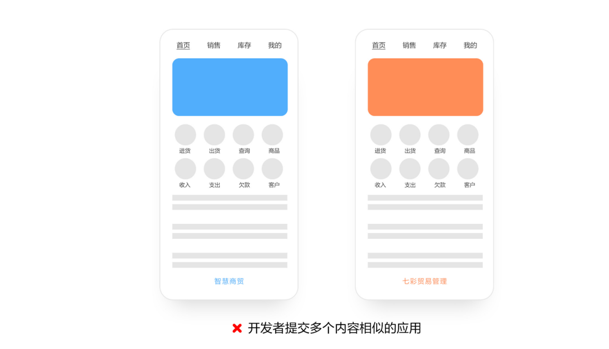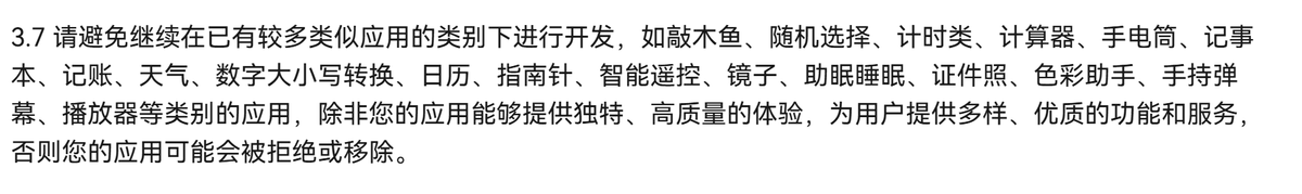被拒原因:开发一个功能与手机系统自带功能(如简易计算器、桌面时钟、手电筒)几乎完全一样的应用;在已经饱和的类别(如敲木鱼、数字大小写转换、简易记账)中,提交一个没有新功能、新体验的同质化应用。