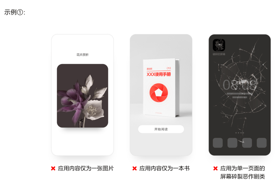 被拒原因:应用仅为信息罗列,比如生活小指南、诗词展示,缺乏深度交互或服务;或者整个应用就是一个H5/Web页面直接打包,比如只展示一张图片、一本书或一个主题。