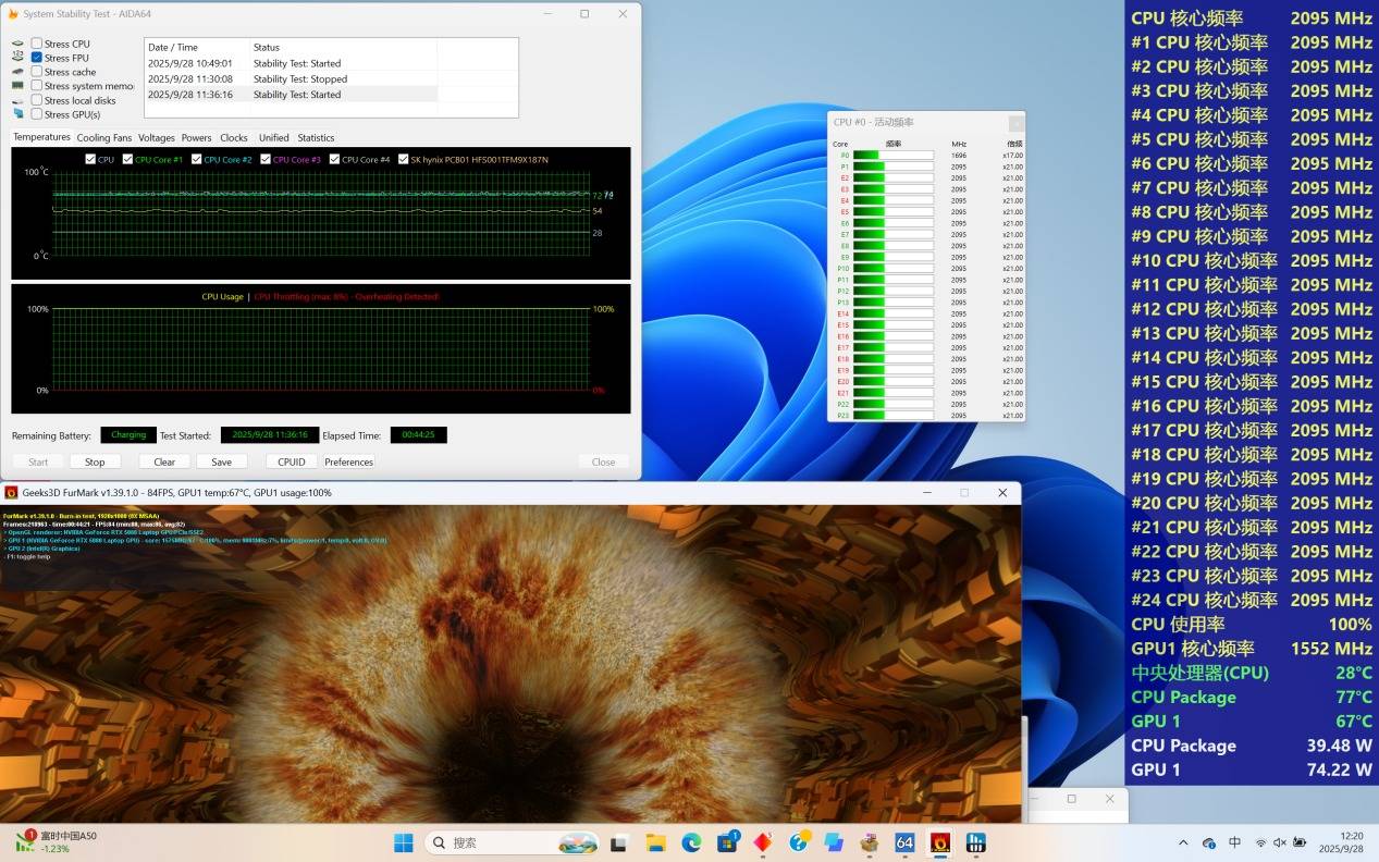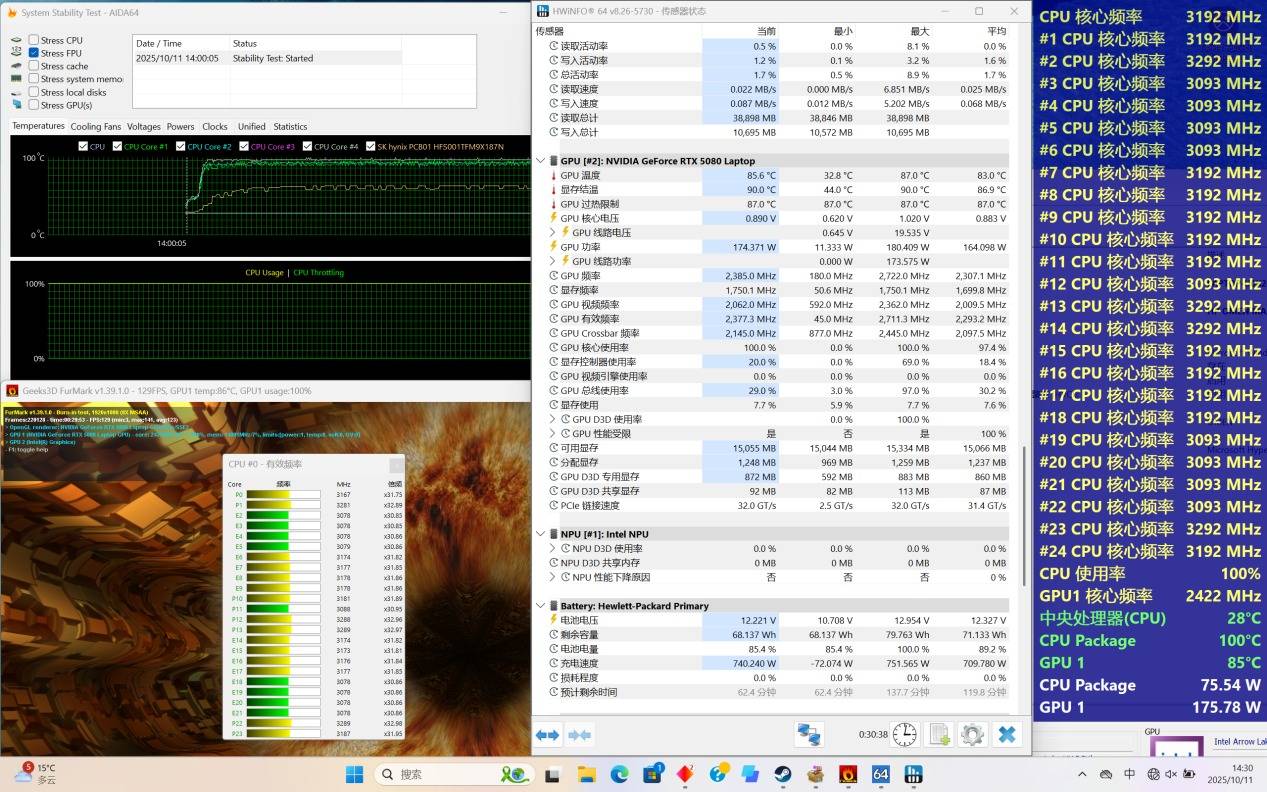 使用AIDA64 Stress FPU+Furmark 1920*1080 8xMSAA进行CPU和GPU的双烤满载测试,CPU功耗75W、温度100度、P核心频率3.1GHz~3.3GHz、E核心频率3.1GHz~3.2GHz;GPU功耗175W、温度85度、频率2400MHz左右;