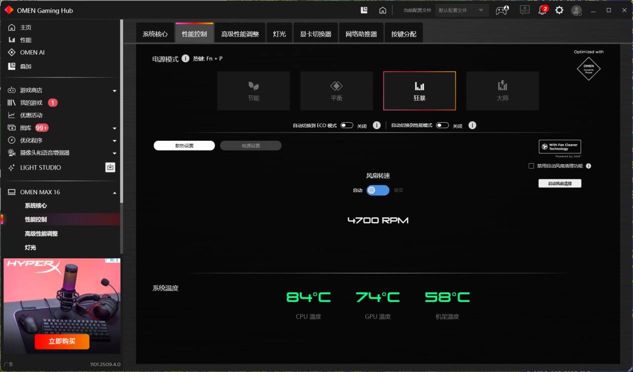 OMEN暗影精灵Max共提供了四种性能模式,分别为节能模式、均衡模式、狂暴模式与大师模式,其中节能模式可限制CPU/GPU性能以延长续航,而大师模式则是开放一些底层硬件参数供用户调节,是一种面向专业硬核用户使用的模式,对于普通用户、小白用户来讲,狂暴模式已经可以获取到核心全部性能表现了,平衡模式则是提供了性能、温度和噪音之间的权衡点,所以我们本次测试主要聚焦于狂暴模式与均衡模式,来看看OMEN暗影精灵在这两个模式下的性能调校与使用体验。