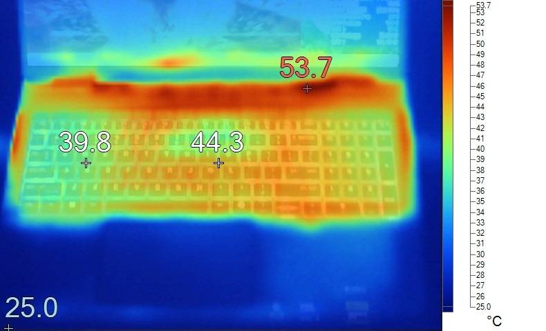 表面温度情况,C面的热点位于右侧出风口区域,温度为53.7度,键盘左侧的主要操作区域,W键和S键中心位置温度不到40度。暗影精灵MAX的C面应该是做了不错的隔热处理,满载时的表面温度并不会过于烫手从而影响使用。